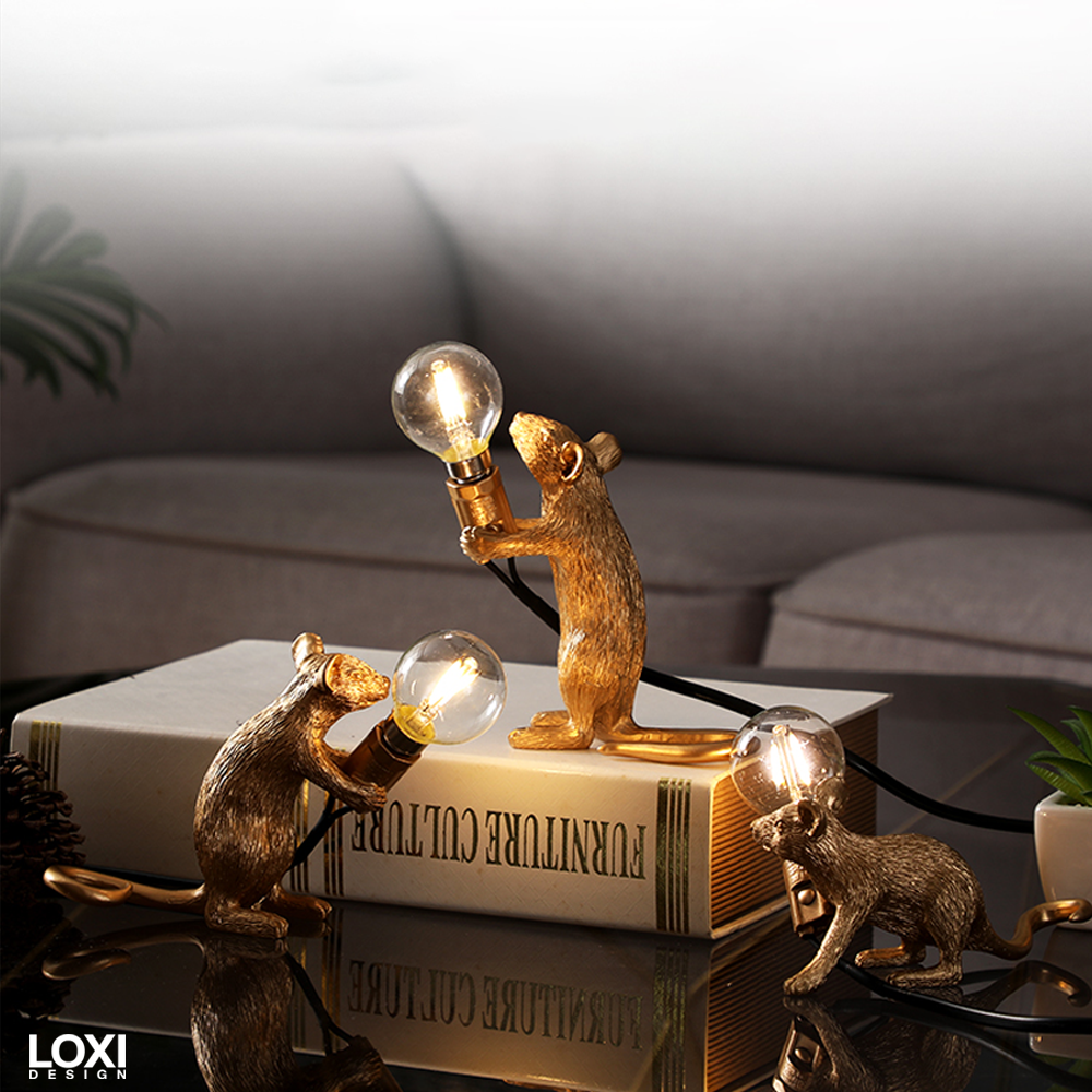 This delightful desk lamp showcases a dainty mouse adorned in golden fur, cradling a light bulb that radiates a warm glow. Its vintage allure, exceptional craftsmanship, and intricate details make it a truly unique, fashionable, and artistic addition to your home.